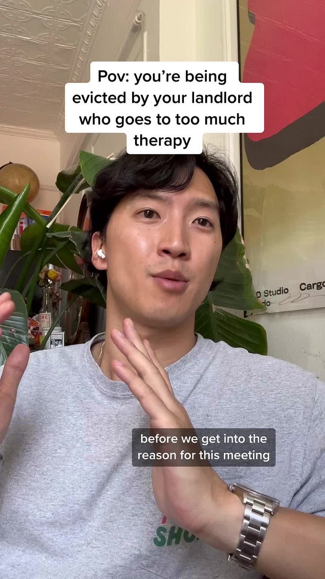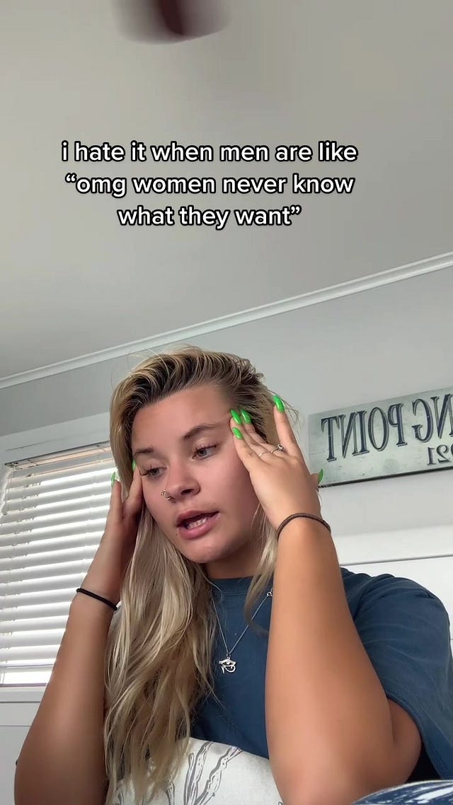 Think what you will about the health of these boundaries. Depending on who you are, different examples will seem unhealthily restrictive, obviously taken for granted, or a normal discussion point in your relationship. Personally, I wouldn’t judge for anything aside from dishonesty, lack of transparency, or failure to meet your commitments. But what all of the above wants/boundaries have in common is that they are expressed materially. They are about concrete behaviors that could be observed and measured from the outside. This is good because they are clear. But the problem is that they aren’t very accurate: at the end of the day, they probably aren’t what you really want. Have any of you ever been in a relationship with mandated good night texts where as soon as they were agreed upon, they started to feel empty and hollow? Or check out this TikTok meme.