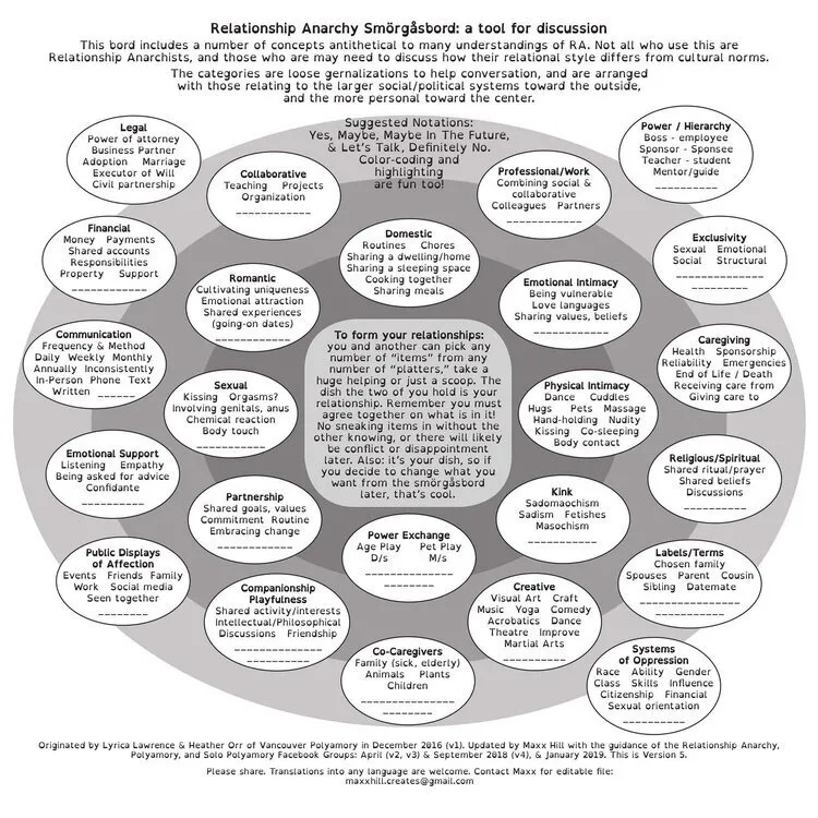 So how do we apply it? Discussion of the boundaries and rules of a relationship has become ever more pressing in my life. I’m not in Utah anymore, and monogamy is far from an assumed cultural default. If anything, strict, normative, monogamy is fairly rare and edgy here. I’ve dated under a variety of relationship styles, and while I tend towards monogamy (I’d rather spend my free time surfing tyvm), any preferences I have are very context-dependent, so heavy discussion is a must. Similarly, angst, negotiation, and miscommunication over the exact boundaries of a romantic partnership is one of the most common support topics my friends come to me with, and easily the biggest source of drama. The RA Smorgasbord is a popular recommendation, but I’ve found the idea of it to be more useful than the actual form.
